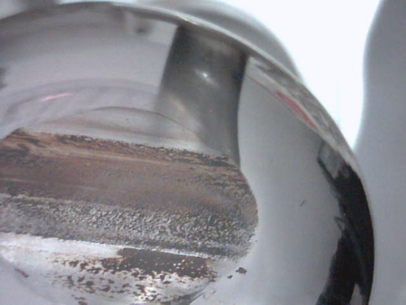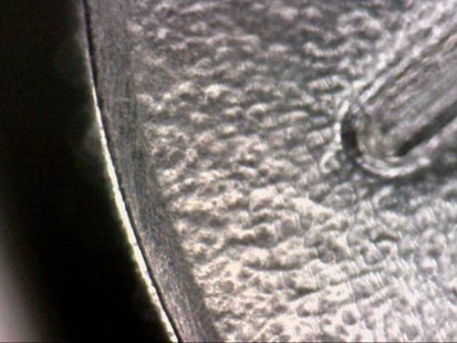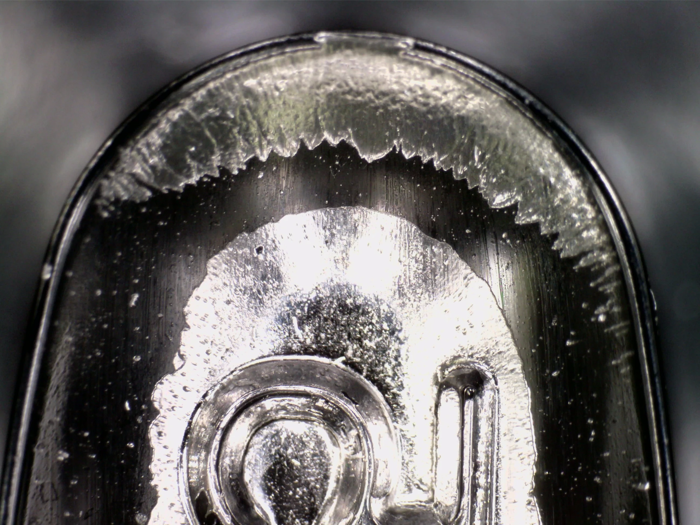 Na zdjęciu przedstawiono typowe ślady zacierania powstałe wewnątrz matrycy. Uszkodzenie jest wynikiem uplastycznienia substancji czynnej o niskiej temperaturze topnienia, prowadzącego do adhezji materiału do bocznych ścian tipa oraz wewnętrznej powierzchni roboczej matrycy. Widoczne są charakterystyczne ślady tarcia oraz miejscowe osady produktu, wskazujące na utrudnione odprowadzanie materiału podczas procesu kompresji. Tego typu zjawisko może prowadzić do wzrostu sił prasowania, niestabilności masy tabletki oraz przyspieszonego zużycia narzędzi