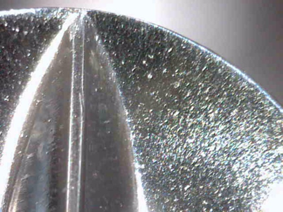 Na zdjęciu przedstawiono typowy przypadek postępującego zużycia powierzchni roboczej stempla, powstałego w wyniku intensywnego, powtarzalnego kontaktu z granulatem zawierającym komponenty o twardej i agresywnej strukturze fizycznej (np. sole mineralne, pigmenty nieorganiczne, niektóre ekstrakty roślinne). Objawy widoczne na zdjęciu obejmują mikrorysy, lokalne matowienie, początkową utratę gładkości oraz nieregularne ślady tarcia w strefie kontaktu z masą tabletkową. Tego typu zużycie zwiększa ryzyko przywierania produktu (klejenia), obniża estetykę tabletek.